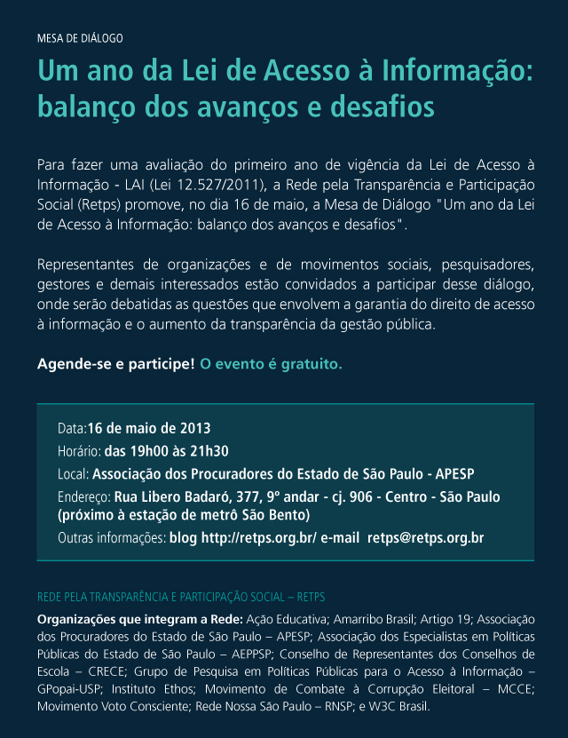 Oi Horácio, peço desculpas por não ter enviado em texto antes. Envio abaixo. Abraços, Caroline Mesa de Diálogo Um ano da Lei de Acesso à Informação: balanço dos avanços e desafios. Para fazer uma avaliação do primeiro ano de vigência da Lei de Acesso à Informação - LAI (Lei 12.527/2011), a Rede de Transparência e Participação Social (Retps) promove, no dia 16 de maio, a Mesa de Diálogo "Um ano da Lei de Acesso à Informação: balanço dos avanços e desafios". Representantes de organizações e de movimentos sociais, pesquisadores, gestores e demais interessados estão convidados a participar desse diálogo, onde serão debatidas as questões que envolvem a garantia do direito de acesso à informação e o aumento da transparência na gestão pública. Agende-se e participe! O evento é gratuito. Data: 16 de maio de 2013. Horário: das 19h às 21h30. Associação dos Procuradores do Estado de São Paulo - APESP Endereço: rua Líbero Badaró, 377, 9o andar - cj. 906 - Centro - São Paulo (próximo à estação de metrô São Bento) Outras informações: blog https://retps.org.br/ e-mail: retps@retps.org REDE PELA TRANSPARÊNCIA E PARTICIPAÇÃO SOCIAL - RETPS Organizações que integram a Rede: Ação Educativa; Amarribo Brasil; Artigo 19; Associação dos Procuradores do Estado de São Paulo - APESP; Associação dos Especialistas em Políticas Públicas do Estado de São Paulo - AEPPSP; Conselho de Representantes dos Conselhos de Escola - CRECE; Grupo de Pesquisa em Políticas Públicas para o Acesso à Informação - GPOPAI-USP; Instituto Ethos; Movimento de Combate à Corrupção Eleitoral - MCCE; Movimento Voto Consciente; Rede Nossa São Paulo - RNSP; e W3C Brasil. Em 19/04/13 17:20, Horacio Soares escreveu: